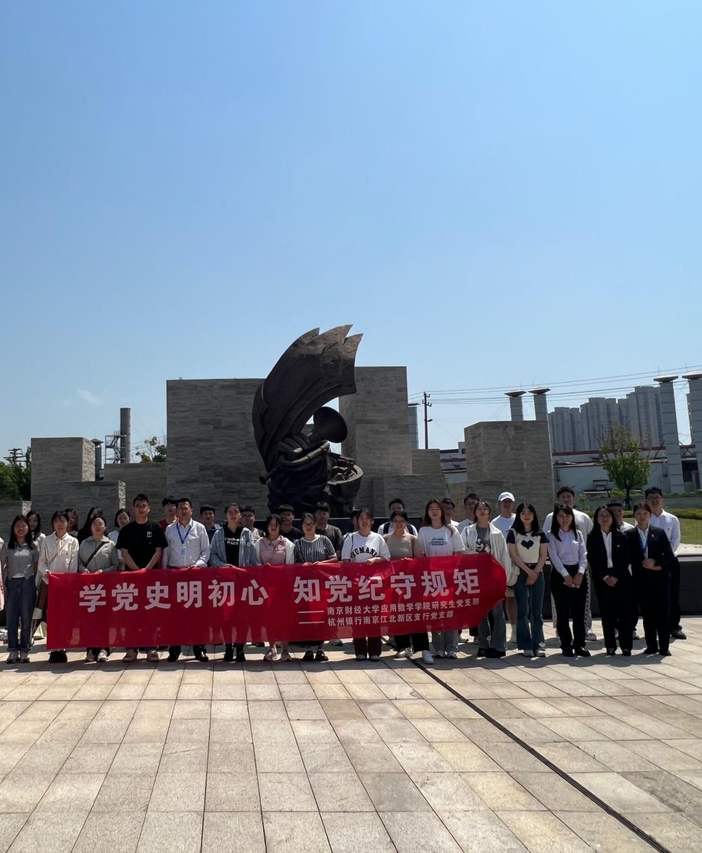 活动现场为深入贯彻落实党的二十大精神,加强党纪教育,提高党员党性修养,5月17日,学院研究生党支部联合杭州银行南京江北新区支行党支部开展“学党史明初心,知党纪守规矩”党史学习教育与党纪学习教育。首先,全体党员来到南京江北新区红色广场。讲解员...