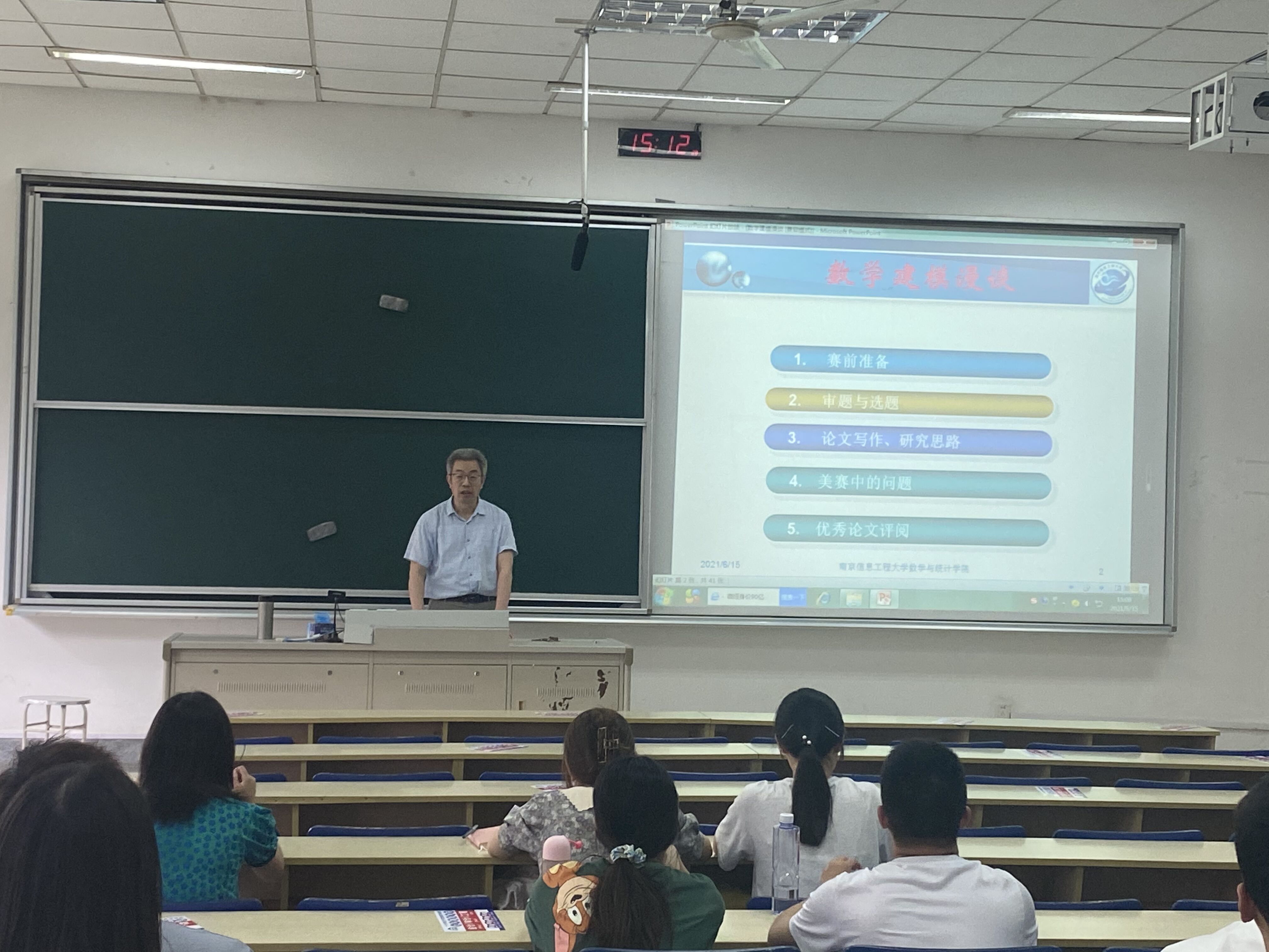 6月16日下午,应我院邀请,南京信息工程大学程国胜教授在仙林校区德济楼112室作数学建模漫谈主题讲座。讲座由我院杨靖三老师主持,参加校研究生数学建模大赛的选手以及对数学建模感兴趣的同学聆听了讲座。
