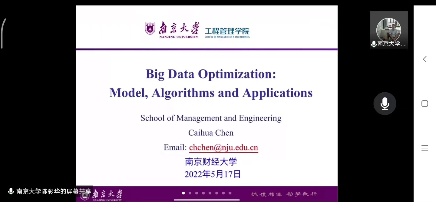 5月17日上午,应伟德victor1946邀请,南京大学陈彩华教授通过腾讯会议作了题为“大数据优化与实践”的线上学术讲座。学院硕士研究生、部分教师参加了此次讲座。