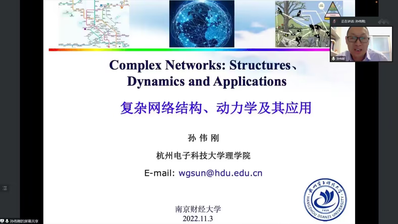 11月3日晚,应我院邀请,杭州电子科技大学理学院博士生导师孙伟刚教授在线上作了题为“复杂网络结构、动力学及其应用”的讲座。讲座由学院应用数学系系主任吴波教授主持,学院大一、大三以及相关学院师生近300人聆听讲座。