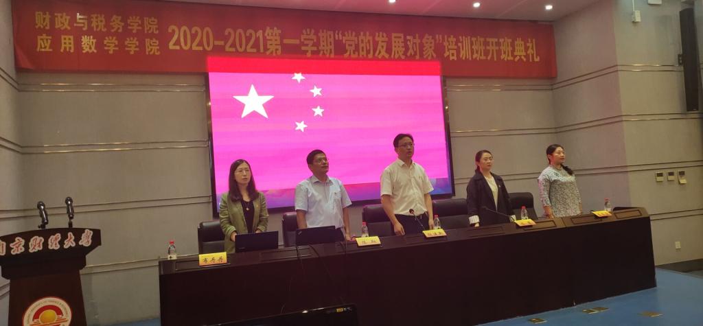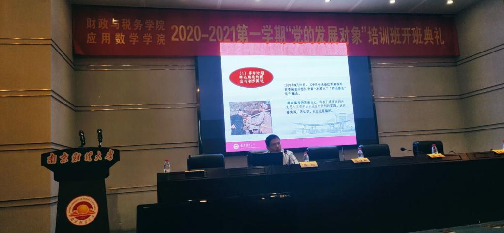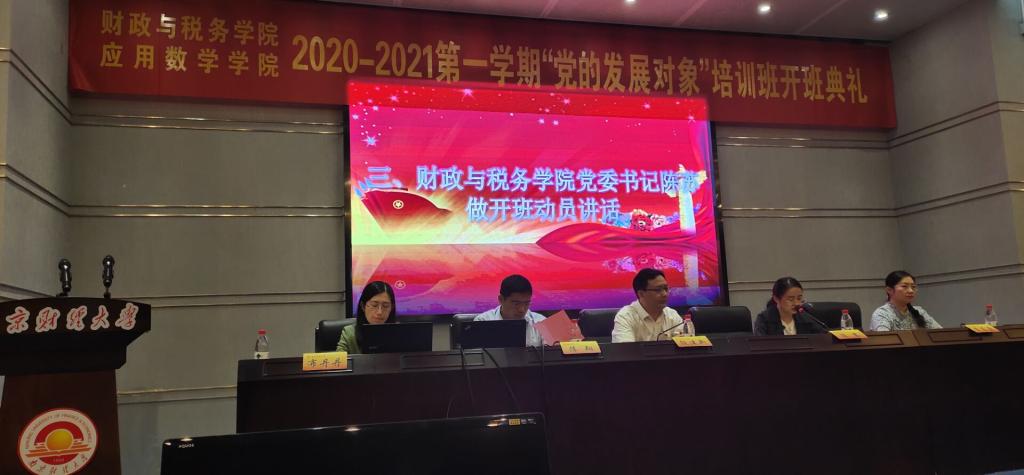 9月27日中午,我院和财政与税务学院联合开展的2020-2021学年第一学期“党的发展对象”培训班开班典礼在行政楼二楼报告厅举行。财政与税务学院党委书记陈苏、副书记李慕原,马克思主义学院党总支书记陈翔,伟德victor1946党总支书记殷建新、院长助理(分管学生工作)布丹丹及全体党校学员参加了开班典礼。开班典礼由伟德victor1946党总支书记殷建新主持。