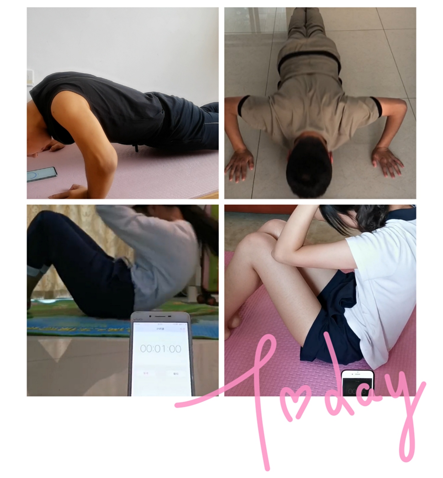 有比赛,就要有公平。为了防止线上录制视频会有同学利用一些剪辑软件来对数量造假,同学们被要求在录制视频时,在旁边放置计时器之类的东西,并且以计时器上的时间为参考,计算出他们所做仰卧起坐或俯卧撑的数量。同时考虑到男生和女生的身体素质的差异,男生进行俯卧撑,女生进行仰卧起坐。这样也避免了男生和女生做同一项目可能会导致的不公平现象。最终金数1902的徐鸿和数学1901的周昕怡分别以一分钟39个俯卧撑和一分钟54个仰卧起坐的成绩荣获男女生冠军。