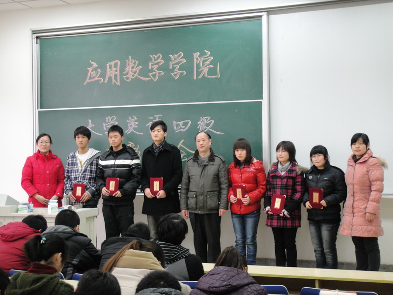 2012年3月16日下午两点三十分,应用数学院英语四级表彰大会在南财大仙林校区Z4-113教室举行。到会的有学院党支部陈益茂书记、辅导员张文文老师,主持大会的是团总支书记龚莉红老师。本次大会共有8项议程。