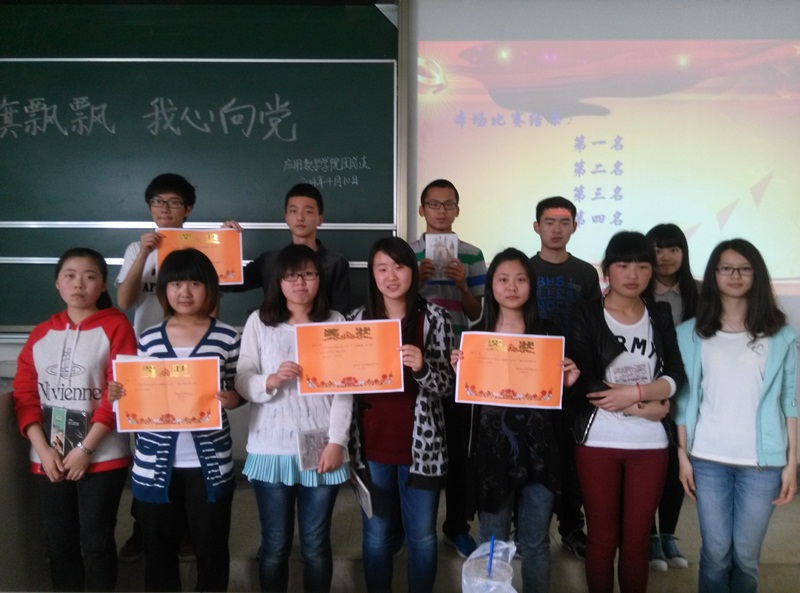 2014年4月10日星期四下午三点在专四114教室,由伟德victor1946团总支主办,2012级和2013级团支部协办的“红旗飘飘 我心向党”党章知识竞赛的决赛圆满举行。 赛前,全体同学起立合唱了《红星闪闪》。接着,比赛正式开始。本次竞赛分为必答题、限时题、风险题三个环节。各代表队基准分为100分,在此基础上通过竞赛增减,比赛结束依据各队得分高低排定名次。金数1301班代表:戴元、陈璇、李响,应数1301班代表:丁沁、严硕、袁鑫,应数1201班代表:卢秀琴、赵羽浦、申新鹏,应数1202代表:丁云峰、宋利平、田步甜。 第一环节,必答题:每队每人1题,按队员场上座位顺序,从左至右,依次为1-3号队员,每题10分,答对加10分,答错扣10分;必答题按每队1-3号队员轮流作答,其他队员不得代为作答或提示,否则扣分;选手答题时间从主持人把题目读完后开始计时,不得超过20秒,超时扣分。 第二环节,限时题:各参赛队选出1名选手作答,限时60秒;在60秒限时里,答对一道加10分,其他两名选手不可提示 在严肃的比赛期间,穿插了活跃气氛的串场小游戏:首先是红歌接唱,台下观众们自愿上台,虽然有些歌曲离我们这个时代很遥远了,但还是有同学能准确接唱出来。后来是经典的“谁是卧底”的小游戏,观众们非常热情地参与游戏,最后由参赛小组中选出各代表参与游戏,申新鹏成功掩盖了自己“卧底”的身份,成为最后游戏赢家,并取得了比赛的五分附加分,而输游戏的其他选手则各自选了不同的搞笑惩罚方式,串场游戏在大家的一片笑声中结束。 游戏过后则是决定命运的第三环节,风险题:风险题分为10分、20分、30分三类,每类各6题,四支队伍抽签分成两组,一队为同组的另一队选题,若对方答对,则对方得相应分数;若对方答错,则选题的一队得相应分数。每队回答三道题;参赛队内部可在相互讨论后,选派一名选手起立作答,答完题应说"回答完毕"后方可坐下,“回答完毕”后不得再补充作答;风险题不按分值区别计时,讨论时间30秒,答题时间30秒,超时无效。 依据以上规则,比赛平稳进行,经过各班激烈角逐,应数1201班与应数1301班基本打成平手,最后应数1201班凭借小游戏中获得的五分额外附加分荣登榜首,而应数1301班紧随其后,应数1202班取得了第三的成绩,金数1301班则退居第四。 在最后,获奖班级班长上台领奖并合照,圆满的结束了本次的知识竞赛。 这是一次比较成功的知识竞赛,答题的同学和台下的观众都接收到了党组织精神的正能量,了解了党章的内容,以及党对时代的最新成果有了更多的认识,这次竞赛也培养了同学们对党的历史与精神有了更加浓厚的兴趣,成果十分喜人。