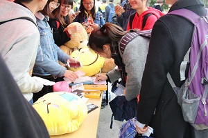 并不单单是简单的答题互动环节,本次的活动还因为“白色情人节”的原因进行了分组,分为单人组,好友组和情侣组。当然对于趣味答题这种项目而言,精美的礼品自然是必不可少的。很多的学生也因为桌上的抱枕,超大玩偶等礼品而积极的投身于活动中来。