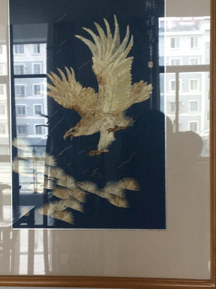 我们小队于上午约8点半抵达位于江阴市青阳镇的旌秀社区,社区中古色古香,洋溢中浓浓的传统文化的气息。我们来的时候,恰逢馆主去北京大学参加活动,因此,姜书记提出带领我们参观展览馆,一路上,我们见到了各式各样的绘画作品,清一色的麦杆画制作,画的整体都是大麦麦秆的金黄色,虽说颜色单调,但画的逼真程度真是让人啧啧称奇,我们不禁感叹,谁说绘画要一笔一勒的勾画,这大麦麦秆制作的豪放风格的麦杆画毫不逊色于浓墨重彩的山水画啊。期间,令我们印象最深刻的是一副老鹰展翅翱翔的作品,金黄色的老鹰展开双翼做扑击状,两爪展开,眼神犀利,鹰嘴开阖,站在其旁,我们仿佛听到了来自山巅的风声鹤唳的鹰鸣声。