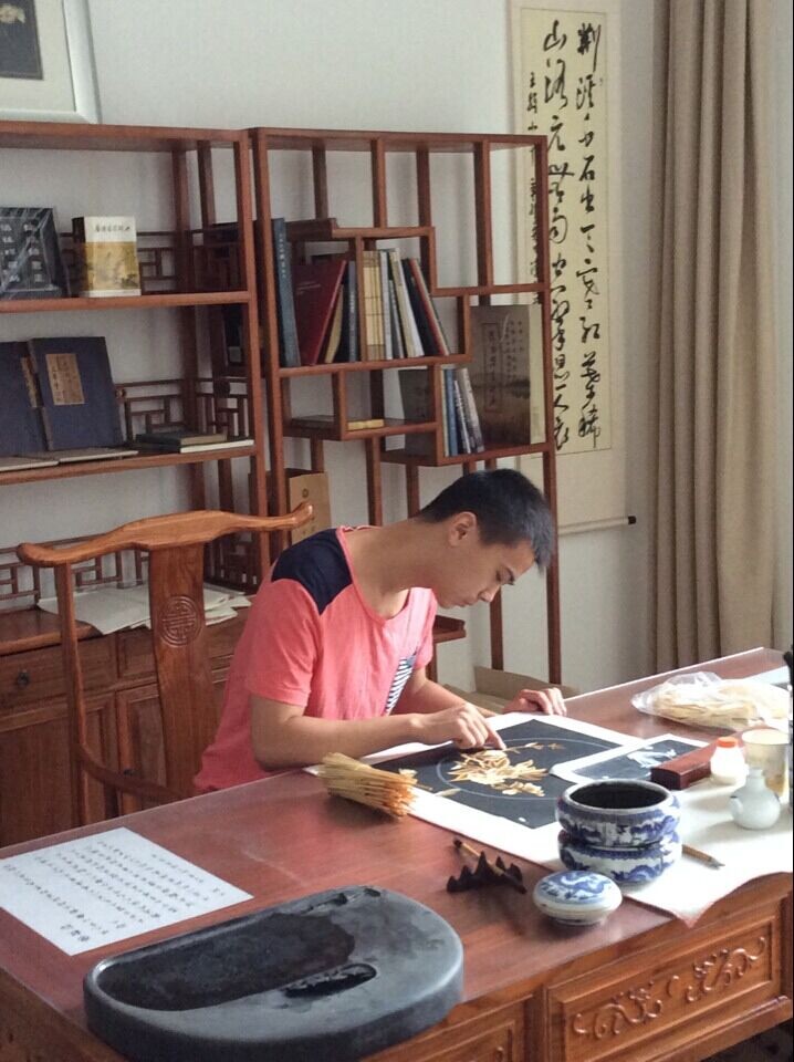 大饱眼福之后,我们也跃跃欲试地想自己动手制作一副,姜书记愉快地答应了我们的请求,一番准备后,我们开始动手摆弄眼前的大麦麦秆。在黑色的画底上,有画师的指导,队员们小心翼翼地“装订”着麦秆,虽然总感觉自己有点笨手笨脚,动作相当粗糙,但经过一番细心刻画,我们还是制作了一副有模有样“麦杆画”,不是相当精美,但我们也都十分激动,毕竟这是我们亲手制作的作品。画师还直夸我们有天赋,弄得我们尴尬不已……