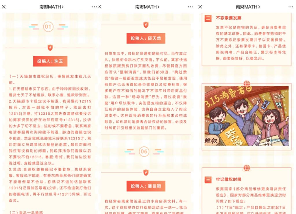在国际消费者权益日来临之际,为了让同学们对这个特别的日子有更深的了解,增强消费者权益保护意识,3月8日至12日,伟德victor1946开展了“3·15”线上投稿消费者权益小故事活动,并在3月13日将同学们的投稿以分享会的形式在学院公众号进行推送。