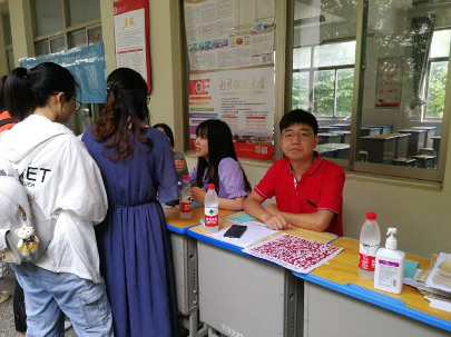 7月24号下午带队老师张闪以及当天负责的两位同学到达学校附近的驻点酒店,在酒店门口进行海报的张贴以及后面几天的招生准备工作。7月25号另一位带队老师抵达酒店,两位老师与学生在酒店给学生与家长进行招生录取工作的解答,并进入学校进行了横幅海报的张贴。7月26号早上七点,两位带队老师以及五位学生准时到达学校,进行招生现场的布置工作。八点,家长学生陆陆续续来咨询,老师以及学生都为家长和学生进行了耐心的解答。给家长提供了南财招生简介以及一系列的资料。7月27号在酒店继续开展招生工作。7月28号上午进行最后的收尾工作。