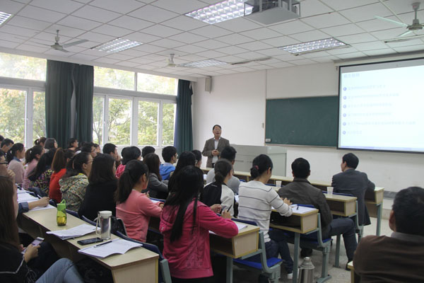 讲座中,曹进德教授用形象生动的语言介绍了复杂网络、复杂系统的概念,并用生活中的例子解释了群集动力学。曹教授阐述了复杂网络以及复杂网络牵制控制的研究背景和研究意义,同时针对研究复杂网络牵制控制的三个主要问题,重点介绍了他们团队基于出入度、M矩阵、左Perron特征向量等研究方法得到的一些重要结果,并提出了一些有待于进一步思考的问题。最后,曹教授与参加讲座的师生进行了热烈的讨论。