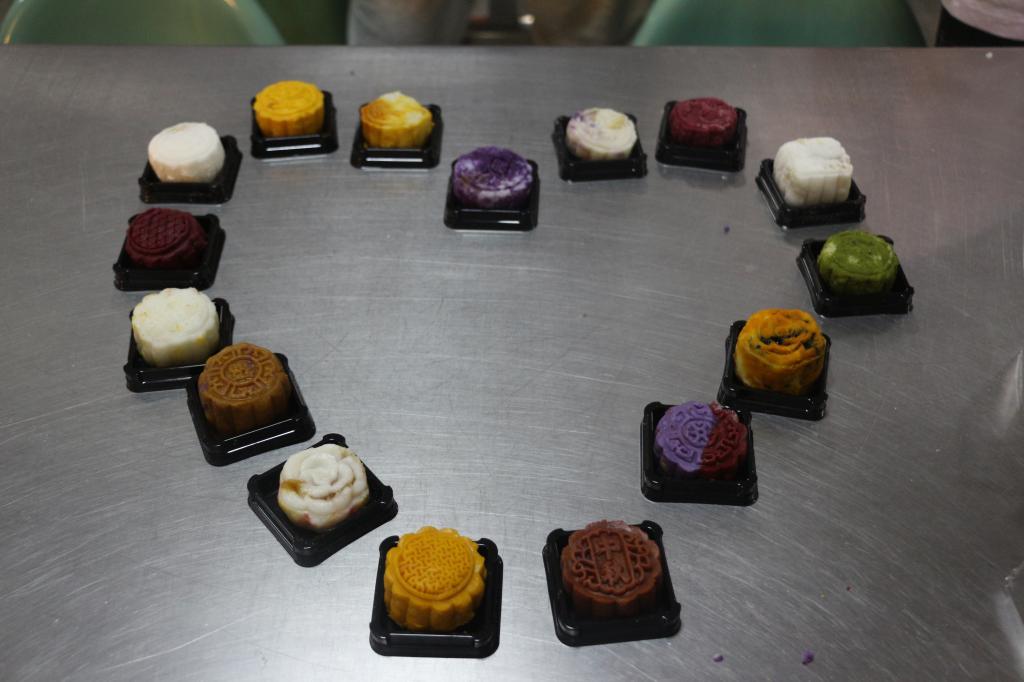 活动之初,学长学姐们精心准备了温水、冰皮糯米粉、手套以及模具等材料和工具。萌新们三三两两结伴而来,欢声笑语绵延不绝,能亲手制作月饼让他们倍感激动。一来到二楼餐厅他们就迫不及待地戴上了一次性手套,加入到了包月饼的阵容。放粉倒水混匀,三个动作一气呵成,将面团揉至光滑后,一分、一塞、一合,馅料就被面团包裹住,再次揉圆,最后再用模具一压,一只完美的冰皮月饼就大功告成。同学之间互相交流,分享经验,整个现场热闹非凡。活动最后,大家在海报上写下了对未来的展望和对祖国母亲生日的祝福并制作了寓意祖国花好月圆的冰皮月饼,还用月饼拼成了一个大大的“爱心“,表达了同学们对祖国母亲的深深热爱。
