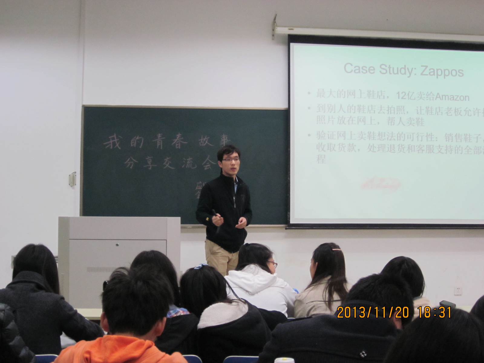 2013年11月20日晚,伟德victor1946金数1301班全体同学,在理工学科楼104进行了“我的青春故事分享交流会”。本次交流会邀请到了蒋意殊学长、陈晶学姐和郁舒涵学姐分享他们的青春故事。