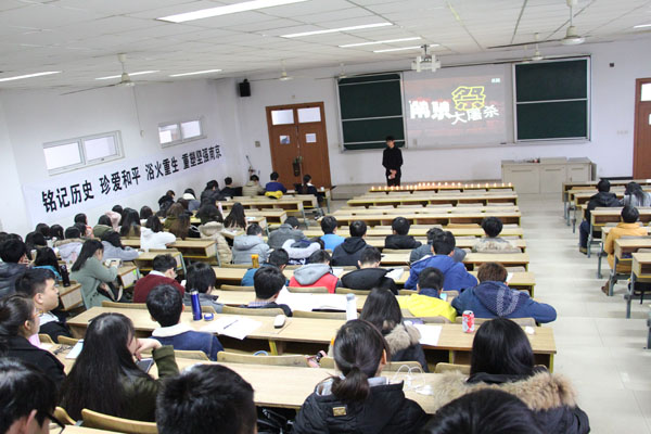 此次国家公祭日主题活动由观看短片《南京公祭日》拉开序幕,同学们在教室点燃蜡烛,祭奠在南京大屠杀中遇难的同胞,怀着沉痛的心情观看了活动宣传片。随后由5名同学进行配乐诗朗诵《少年与中国说》,表达了广大的青年学子奋发图强,振兴中华的豪迈之情。此后,同学代表结合课堂所学的中国近现代史知识和自身学习经历,分享了不忘历史,努力学习,报效祖国的感想与决心。最后全体同学举行”铭记历史、珍爱和平“签名活动。