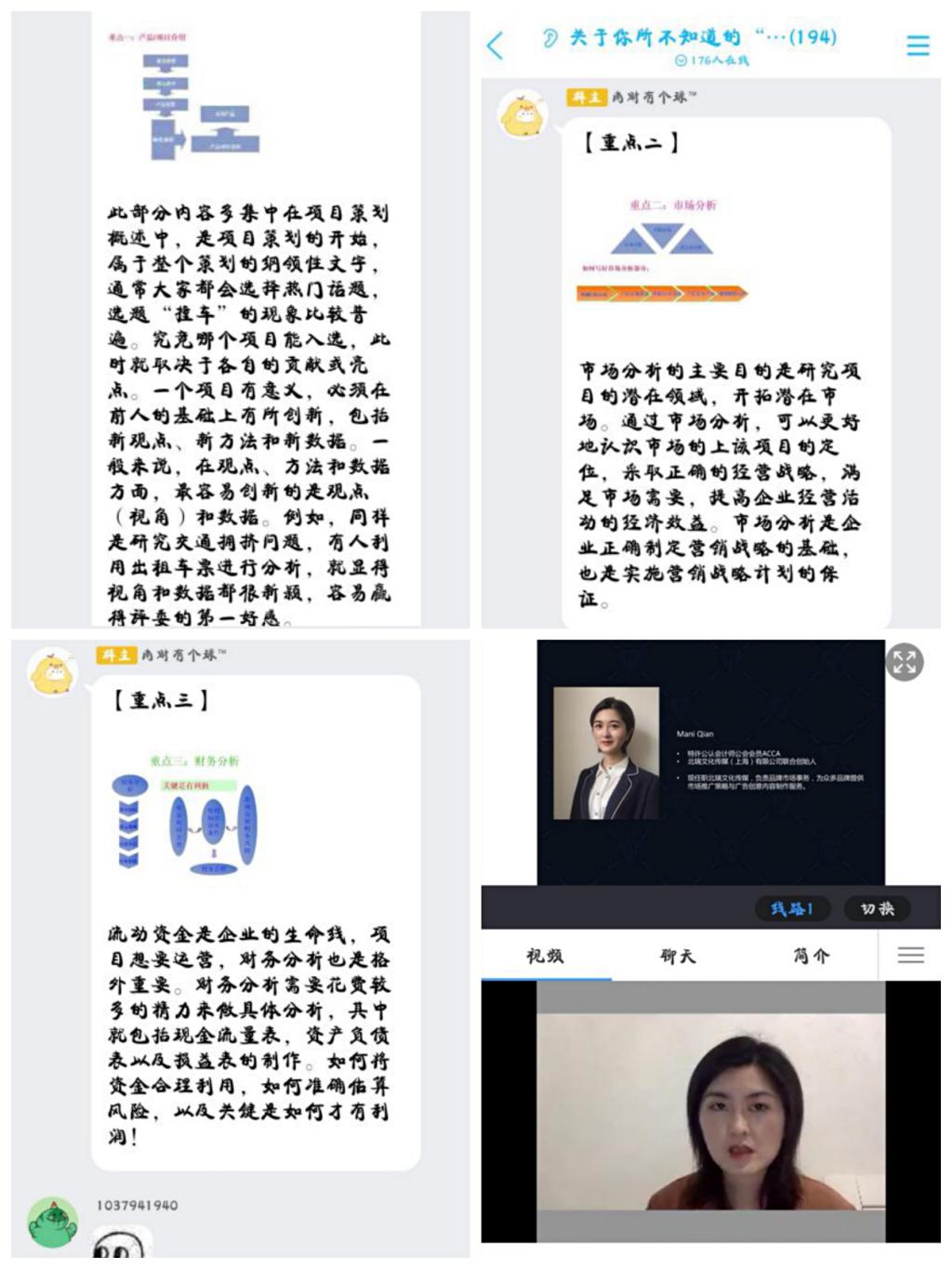 稍后,在线上直播讲座的过程中,Mani老师首先向同学们讲解了参加大创比赛的意义,大学生创新创业比赛不仅是一个展现个性的平台,而且为同学们提供了与社会交流接触的机会。接着老师介绍了大创项目的定义和分类,大创项目分为“创新训练项目”“创业训练项目”“创业实践项目”三个类型,老师详细地向同学们介绍了三种项目类型的区别。然后,Mani老师重点为同学们讲解了项目选题方面的内容,大创选题要立足生活,抓住社会重点、热点、难点问题,并结合“互联网+”现代信息技术深入分析市场需求,为相关行业解决生产、管理中的实际问题。老师结合宠物行业为例,为同学们具体讲解了如何用定性和定量分析相结合的方法深入了解市场需求,并进行行业预测。最后,Mani老师向同学们提供了一些宝贵的建议,她建议说:组队的时候要尽可能选取不同学科、专业的同学,这样才能知识互补,分工合作;项目申报书撰写的时候要细致考量、周密规划,应详略得当、一目了然。Mani老师的解答涵盖各个要点,层层深入,帮助同学们更加深入地了解了大创比赛相关内容以及项目申报书的撰写。