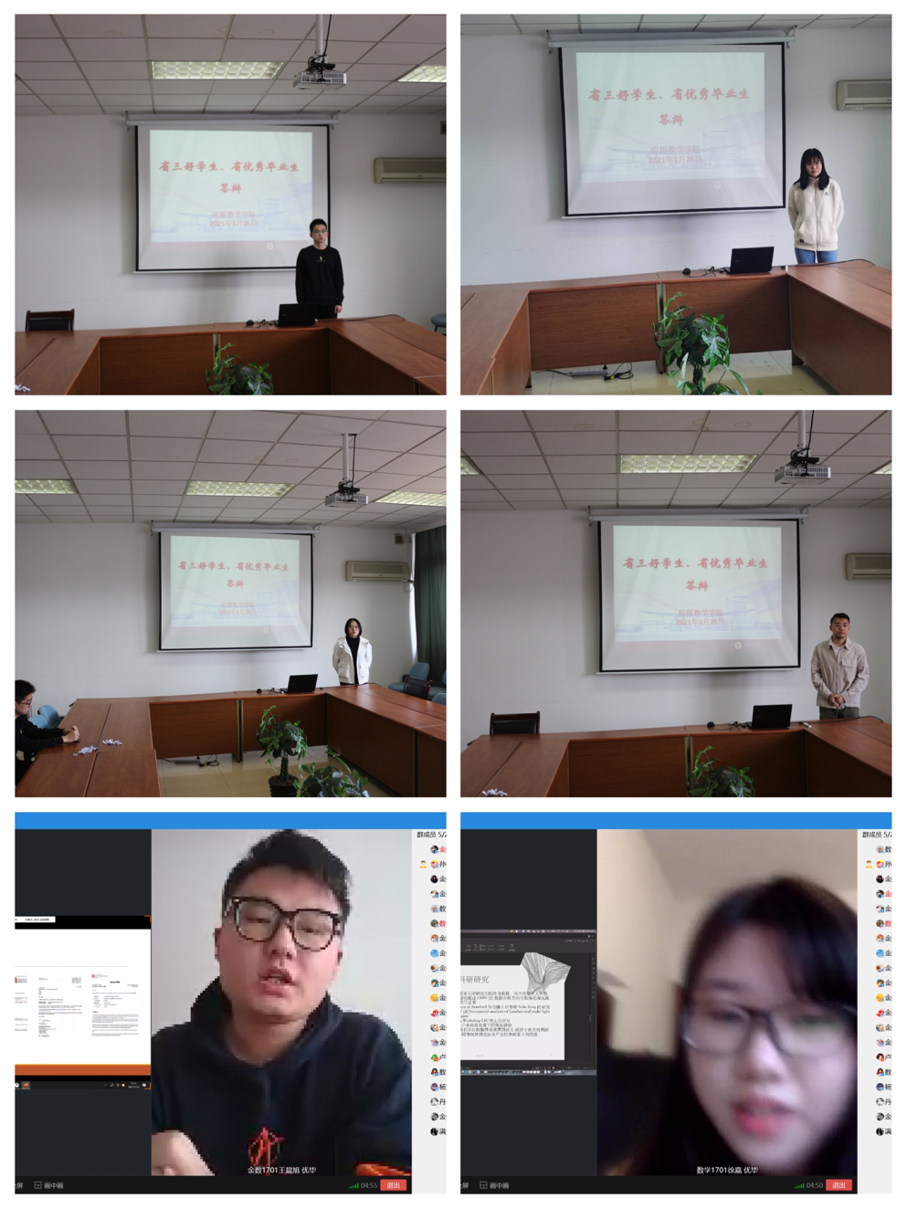 为进一步弘扬青年学子的积极进取、勤奋钻研精神,挖掘身边的优秀榜样,表彰先进,发挥优秀青年的模范带头作用,3月26日下午,伟德victor1946在仙林校区德业楼530会议室通过线上线下相结合的形式开展2020-2021年度“省三好,省优毕”公开考评会。来自各年级共10位优秀学子参与角逐。院党总支副书记布丹丹、分团委书记孙晓飞、本科生辅导员卢艳梅、刘文川等老师出任评委。
