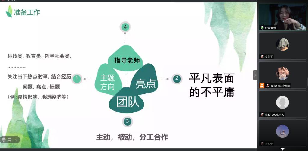 会议伊始,主持人金数2001班郑雯轩同学为大家简明扼要地介绍了“互联网+大学生创新创业”大赛的大致情况。互联网+大赛模拟了一个产品的整个诞生流程,即从产品的创意设计,可行性分析到市场的需求分析等一系列流程。总的来说“互联网+大学生创新创业”大赛是一个培养创新型人才,激发大学生创业热情,并将大学生项目与社会对接的优质平台。