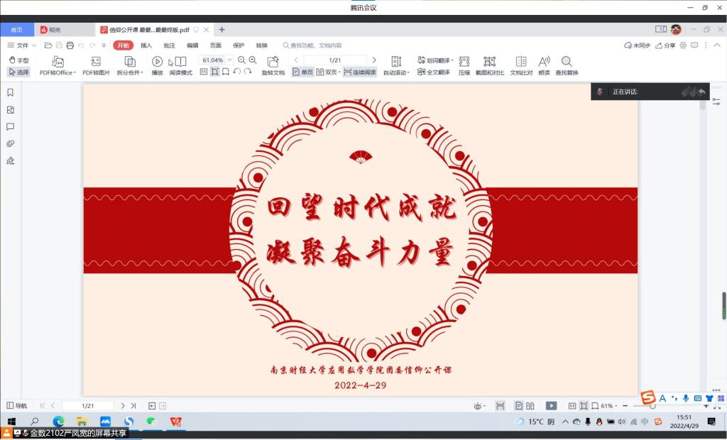 为引导青年学生深入了解新时代的伟大成就,激励学生在新时代新征程上披荆斩棘、奋勇前进,4月29日我院在线上开展以“回望时代成就,凝聚奋斗力量”为主题的第十一次信仰公开课,由团委秘书部严凤宽和宋焱博主持,院团委全体成员参加。