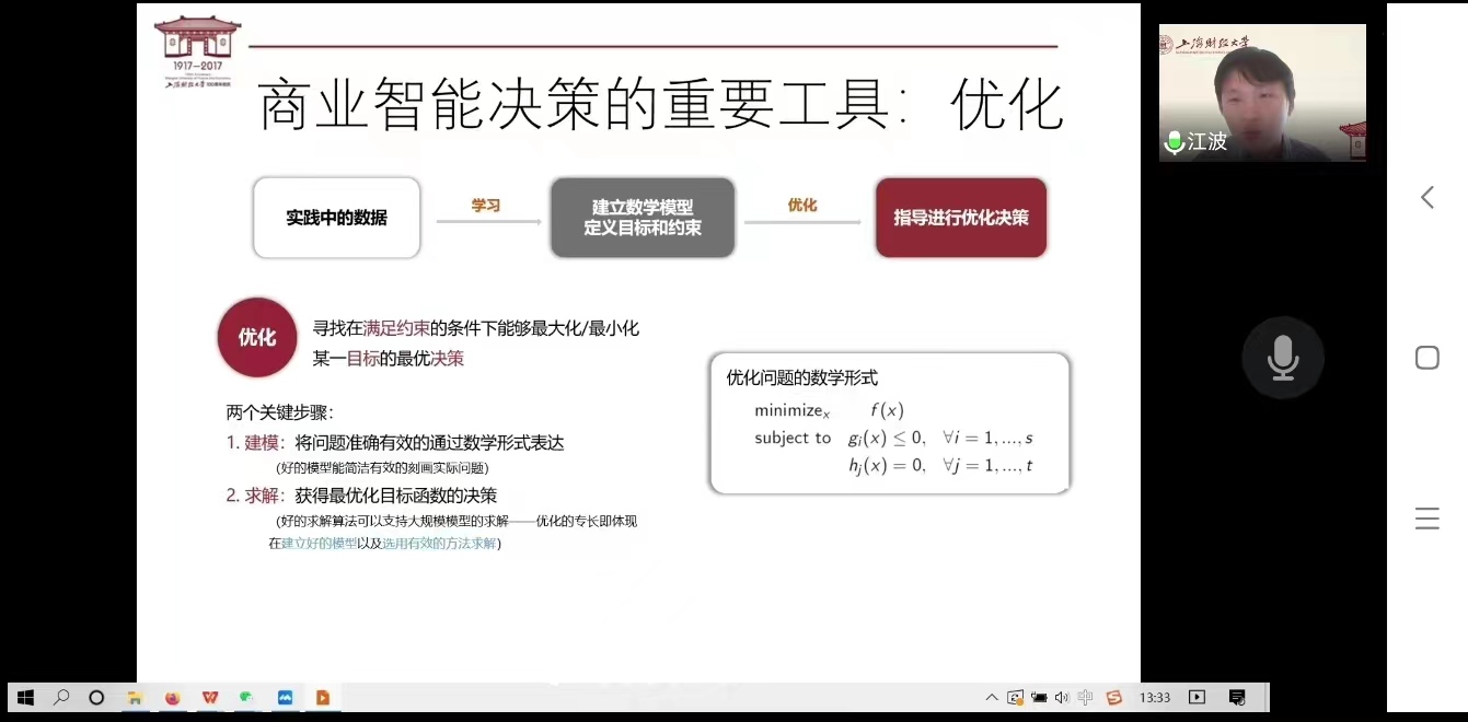 5月13日下午,应伟德victor1946邀请,上海财经大学江波教授通过腾讯会议作了题为“收益管理中的优化模型与方法”的线上学术讲座。学院硕士研究生、部分教师参加了此次讲座。