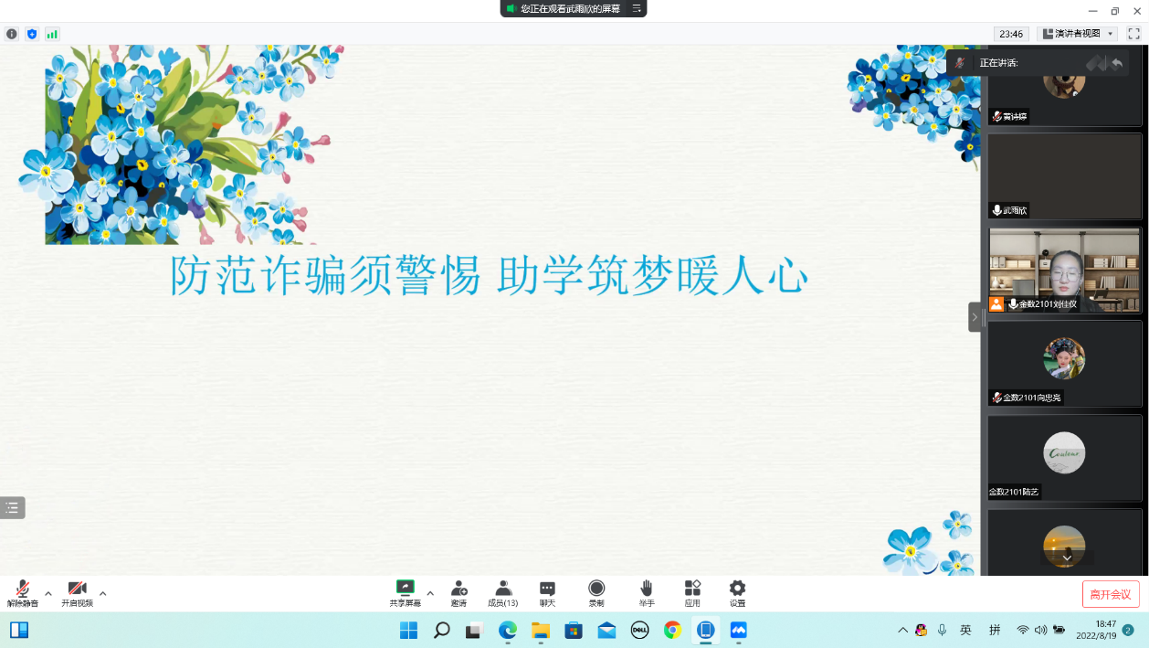 为增强大学生的自我保护意识,提高对诈骗术的分辨能力,学会用法律手段维护自身利益,8月19日晚,我院在线上举办了以“防范诈骗须警惕,助学筑梦暖人心”为主题的活动。21级学生、22级全体新生参与活动。