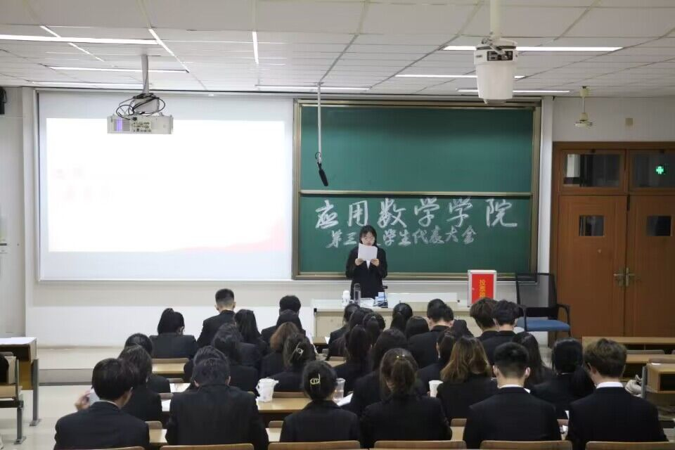 第二次全体会议上选举产生应用数学学生会第十九届主席团。各代表有序地进行了表决及投票工作。根据表决意见,大会顺利通过了工作报告的决议及大会选举工作人员名单。根据各位代表的投票结果,我院第十九届学生会主席团由朱骅、朱奕衡、蔡鑫媛3位同学组成。