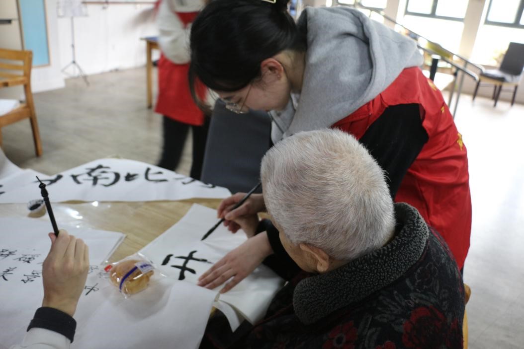 书画交流:共品书墨芬芳。参加本次活动的志愿者中,还有来自学院“红石榴班”的少数民族同学,他们发挥自己在传统书画上的特长,与爱馨护理院的老人们进行书画交流。国风浓厚的毛笔字让大家跨越了年龄的鸿沟,宣纸与墨汁的碰撞也拉近了同学们与老人的距离,同学们惊叹于老人们的笔法力透纸背、入木三分,老人们也热情地将经验和技法传授给同学们,大家在切磋交流中感受着毛笔的起落顿挫,享受运墨收笔、体会一撇一捺间蕴含的人生哲理。