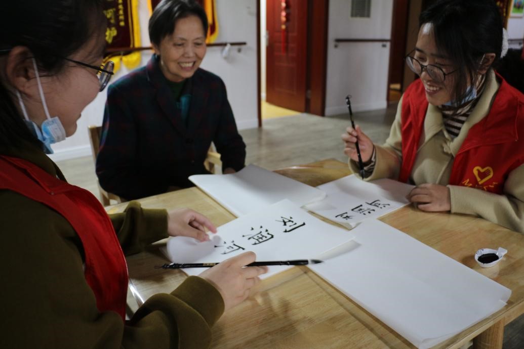 志愿者与老人一起写毛笔字