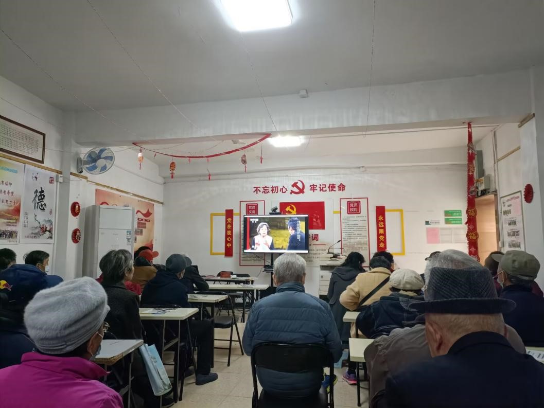 志愿者与老人一起观看文化节目并交流感悟