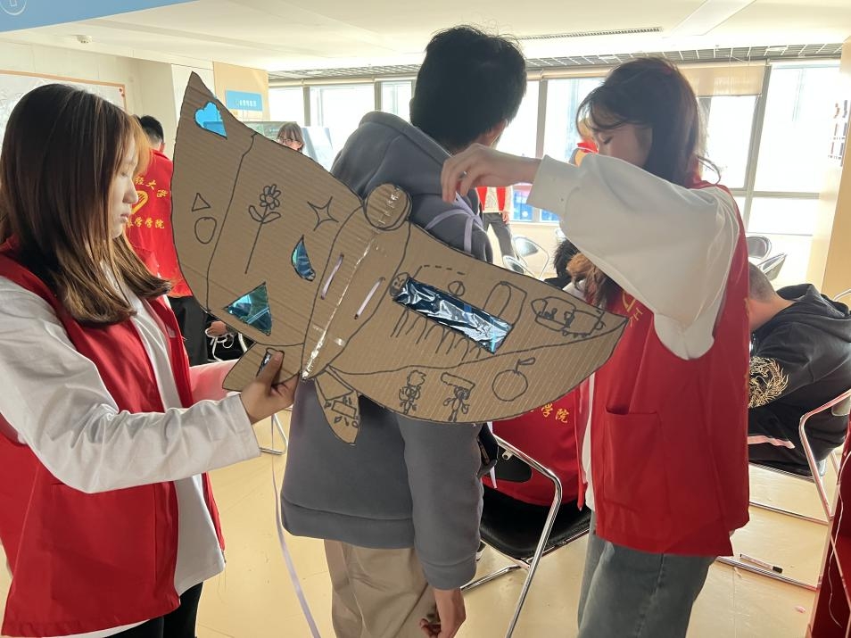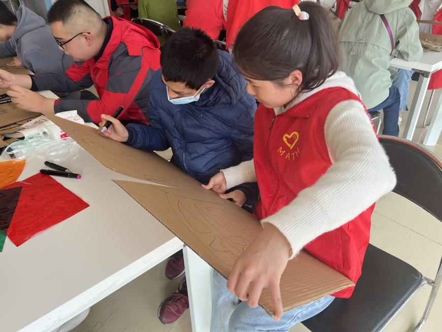 活动中,志愿者们向障碍人士介绍手工制作光影翅膀的流程,一点点引导他们亲自动手操作。志愿者的轻声细语驱散了学员们的拘谨,他们在志愿者的帮助下,用彩笔在纸板上画出自己内心的翅膀轮廓,勾勒出镂空图案,为自己的翅膀挑选美丽的彩色玻璃纸并进行裁剪和粘贴,一步一步地将自己心中向往的翅膀形象呈现在自己眼前。过程中,志愿者们用温和的语气引导他们,用细致耐心的态度打开了学员们的内心世界,建立起了信任的桥梁。学员们也从小心翼翼到勇敢尝试,在志愿者耐心的指导下充分发挥了自己的想象力。制作完成后,志愿者们帮助学员们佩戴上自己亲手制作的光影翅膀,收获感与成就感充盈着每个人的内心。