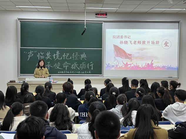 11月16日中午,我院在德业楼117教室开展以“‘声’临其境忆经典,传承使命砥砺行”配音大赛暨主题信仰公开课。我院团委书记孙晓飞、院团委全体成员和各年级学生代表参加了活动。
