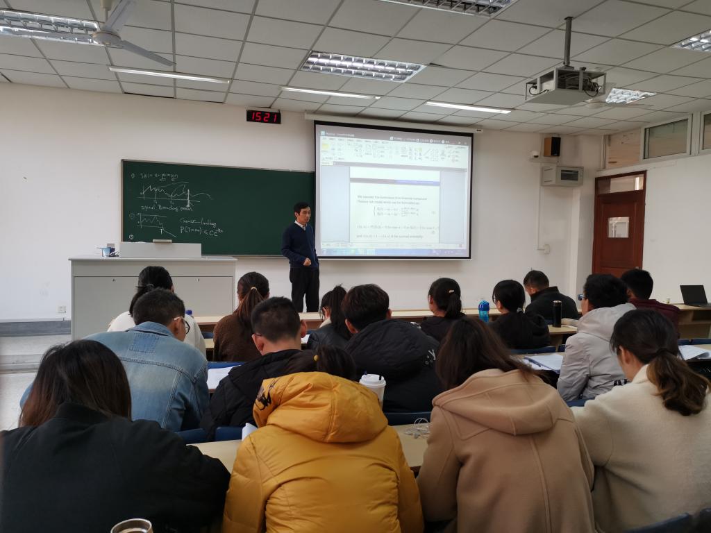 李应求教授首先介绍了随机环境中的G-W过程、双性分支过程的条件平均生长率等问题,随后给出了该过程条件平均生长率的上下界,最后讨论了交配单位归一化数量与每一代雌性或雄性数量的等价性定理。郭军义教授从最简单的问题入手,介绍了随机过程在金融保险中的应用,以及风险理论,应用概率和金融保险中的随机优化等问题。讲座中,两位教授深入浅出地剖析有关问题,并启发大家跟他们一起思考。