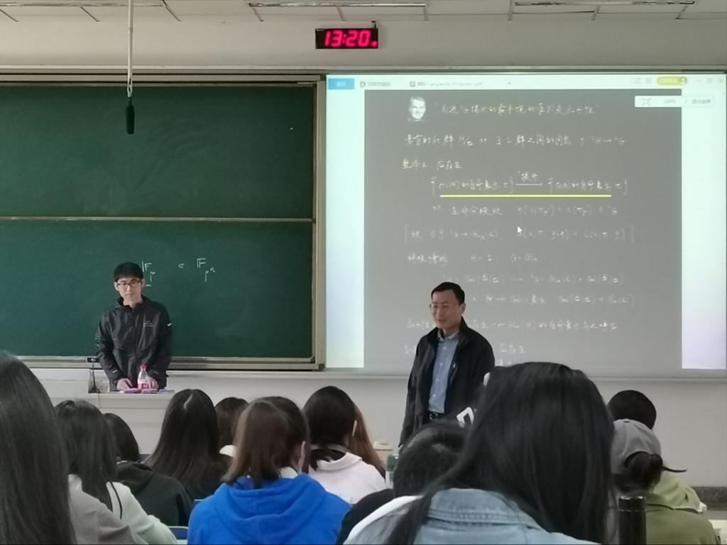 张翀教授从数论关心的基本问题—丢番图方程的求解入手,讲述在历史的进程中,朗兰兹纲领起到联系表示论与数论的重要应用,体现数论问题用表示论的分析方法求解数论问题的有趣现象。最后,张翀教授分享了自己的本科学习经验,并勉励同学们要珍惜大学时光,不负青春韶华。