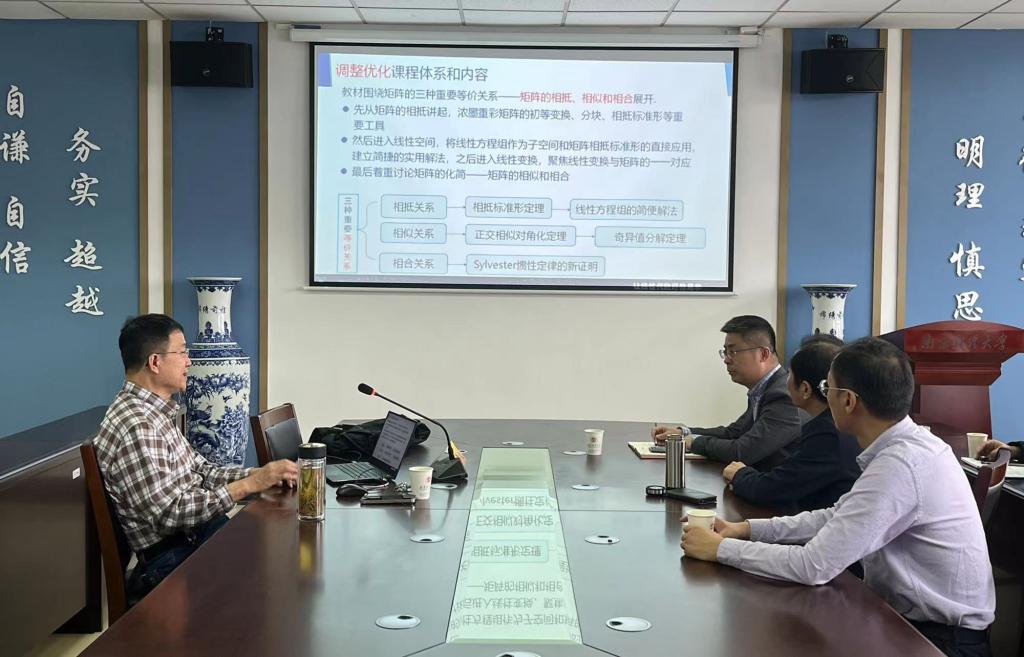 王卿文教授以教育数学与线性代数一流课程建设为背景,从在线性方程组基础解系的新求法、一般线性方程组的新解法、分块矩阵的使用等方面介绍了线性代数等大学数学课程的教学改革情况。王教授强调在教育数学思想的指导下,需要大力推进线性代数一流课程教学方法的改革,明确教学目标,重塑教学内容,改革教学评价,以学生为中心,着力培养其数学创新思维,进而满足对创新人才培养的要求。王教授的报告主题突出、观点新颖、内容丰富、讲解透彻,极具说服力与感染力。讲座结束后,王卿文教授还与在场教师进行了广泛深入的交流。