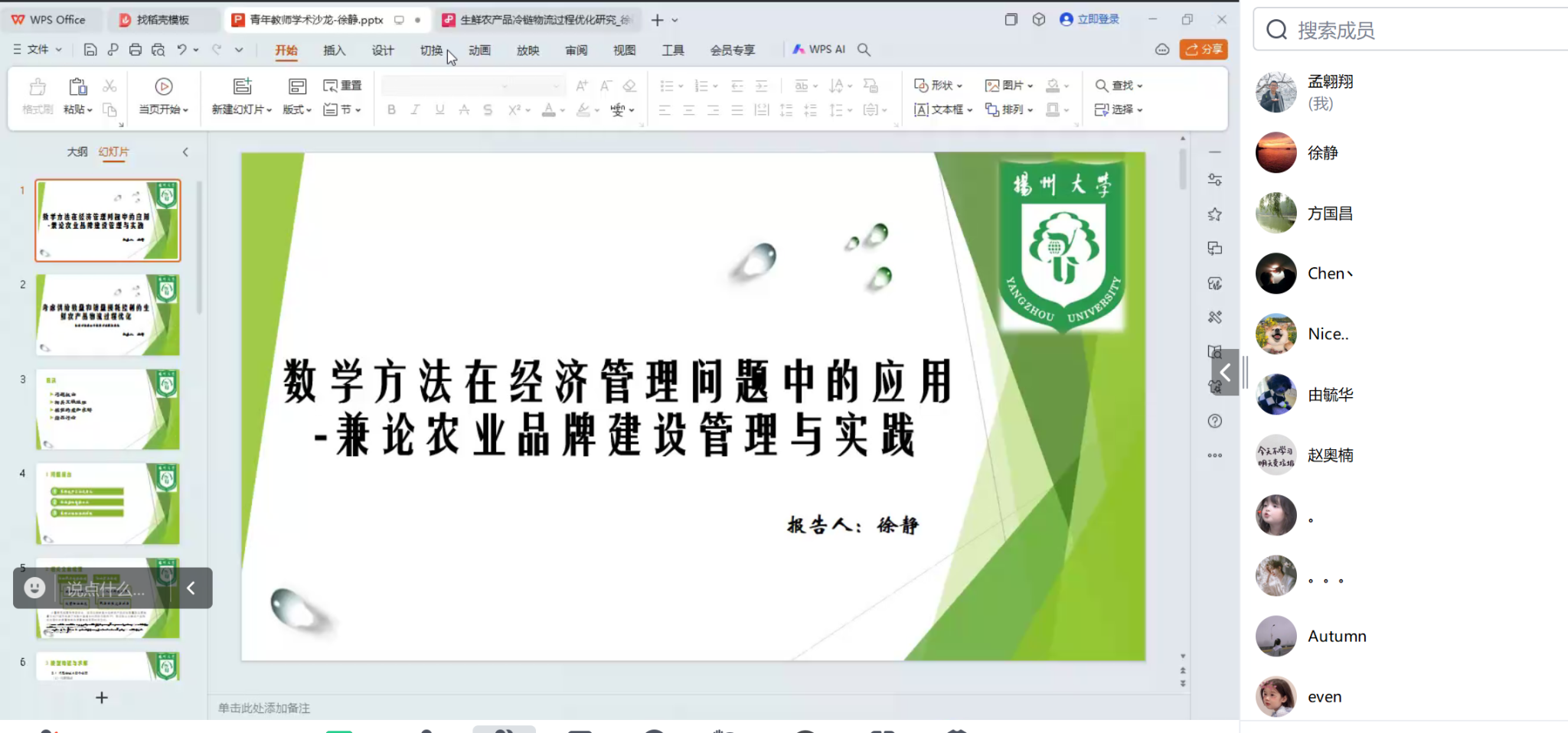 徐静教授首先提出了农业品牌建设中的常见问题,其次详细介绍了在农产品物流与供应链管理中数学模型的构建与求解方法,并且进一步介绍了近期相关研究工作。最后,徐教授结合自身的科研经验与师生们就如何更深入地开展调研进行了探讨和交流。此次报告提升了师生们的学术交流水平,开阔了科研视野,极大地提高了研究生对科研工作的热情。