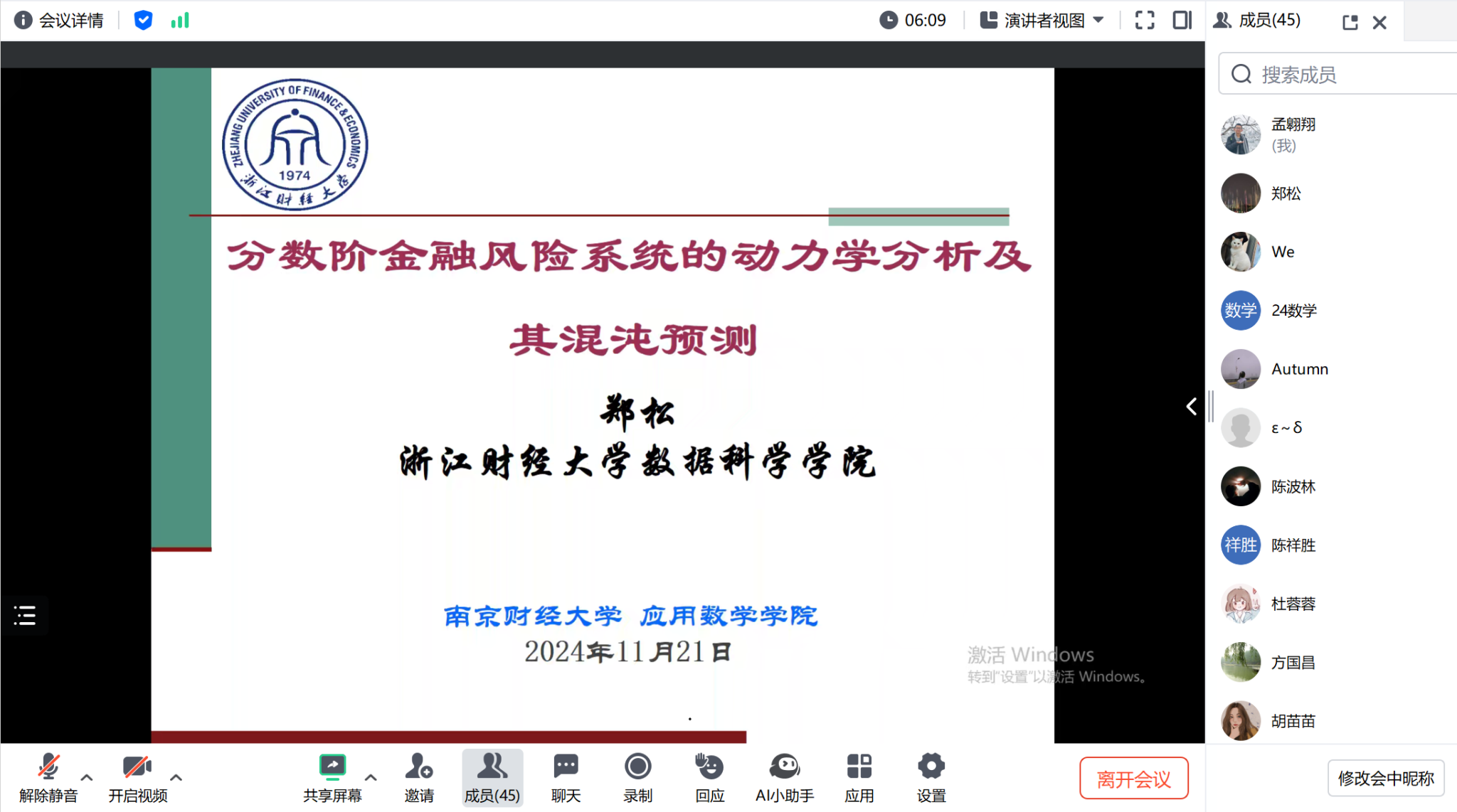 11月21日,应伟德victor1946邀请,浙江财经大学郑松教授通过腾讯会议作了题为“分数阶金融风险系统的动力学分析及混沌预测研究”的学术讲座。伟德victor1946相关教师、研究生和其他学院感兴趣的研究生参加了这次讲座,讲座由伟德victor1946院长方国昌教授主持。