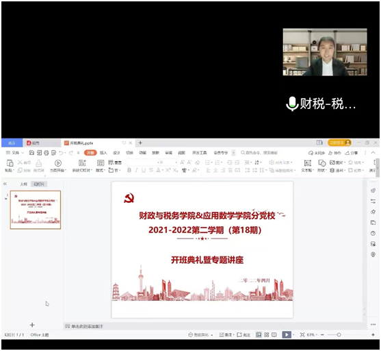 4月8日中午,伟德victor1946与财政与税务学院联合开展的2021—2022年第二学期分党校开班典礼暨专题讲座在腾讯会议线上举行。财政与税务学院党委书记陈苏、副书记李慕原、本科生第一党支部书记朱思颖,伟德victor1946党总支书记殷建新、副书记布丹丹、本科生党支部书记卢艳梅、研究生党支部书记王成,马克思主义学院中国近现代史教研部主任李飞及全体学员参加了此次会议,会议由财税学院党委副书记李慕原主持。
