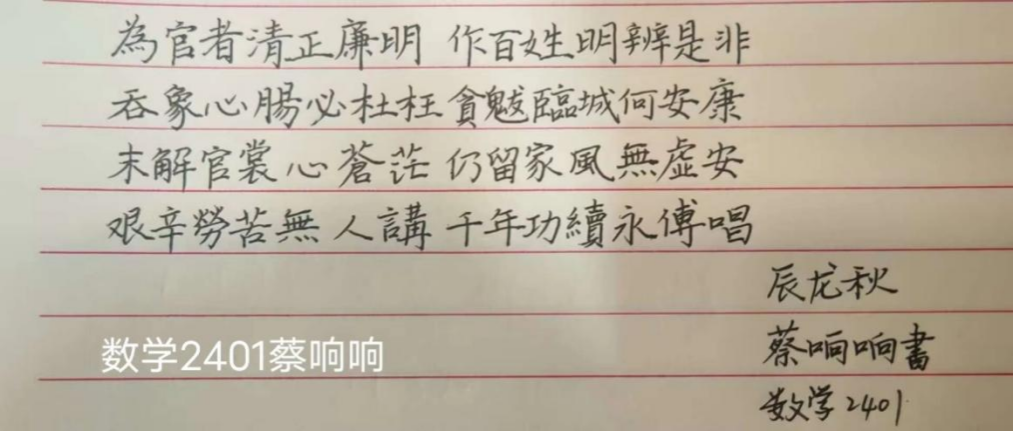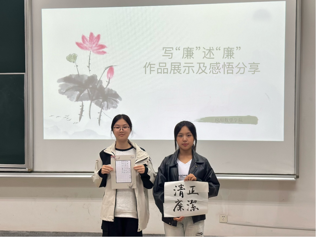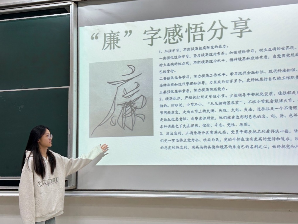 活动分为写“廉”和述“廉”两个环节。写“廉”环节中,同学们以笔为媒,用硬笔、软笔等不同形式,书写与“廉”有关的字、诗词、自创诗等内容,写下心中对廉洁的感悟与坚守。述“廉”环节中,同学们通过自己的书法作品,表达对“廉”的态度和看法。他们结合当下社会实际,阐述了廉洁在当代社会中的重要意义。同学们表示,无论是在学术领域杜绝抄袭舞弊,还是在未来的职业生涯中抵制贪腐诱惑,廉洁都是不可或缺的品质。
