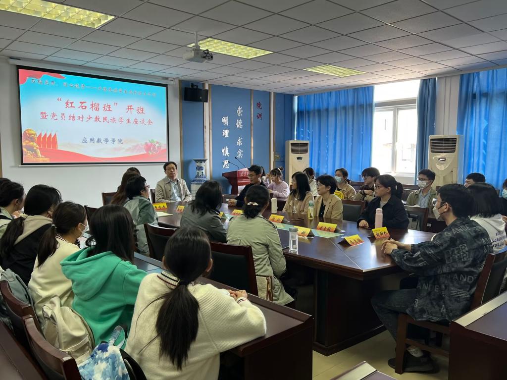 布丹丹副书记介绍了成立“红石榴班”的背景和目的,希望通过党员结对帮扶,有效发挥党员先锋模范作用,对少数民族学生进行思想引领、学业帮扶、生活指导,让同学们感受到学院和党组织的温暖。她依次介绍了“红石榴班”的班主任、职业规划导师、心理导师和学业导师,分别由学院教工党员担任。班主任马玉敏老师表达了对“红石榴班”的美好期待,表示会在接下来的工作中扎实做好学业指导和精准帮扶,助力少数民族学生学业进步。来自满族的金数2201班李媛同学作为少数民族学生代表,以个人经历和民族故事生动表达了对党和国家及学校的热爱与感恩之情。座谈会上,师生畅谈不同民族的发展和变化,交流分享个人的学习和生活情况,现场氛围十分热烈。