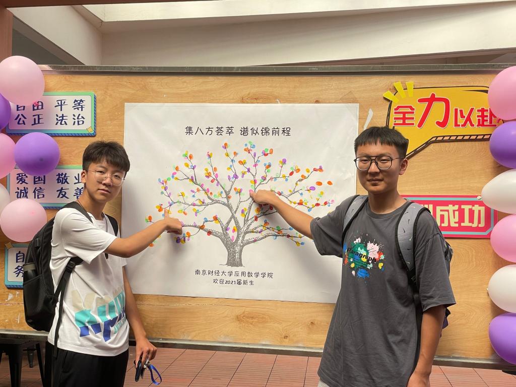 按手印,汇希望,数院有你“财”精彩。新生们移步德业楼六楼,参加“迎八方荟萃,绘似锦前程”按手印汇希望迎新活动。六楼有一块画着大树的画板,大树上树叶落了很多,一根根树枝直直地冲向天空,它仿佛急切地等待着春天的到来。新生们急切又郑重地借助印泥将自己的手印印在画板上,希望大树能够变得生机勃勃。每一位新生的手印都代表着一片不一样的“叶子”。一百四十余片独特的“叶子”生长在代表着数院大家庭的树干与树枝上,共同绘制成了一棵枝繁叶茂的参天大树,希望21级新生的到来就像嫩叶发芽一样为南财数院注入新的活力,迎接更辉煌的未来!“留下手印是一份喜悦,也是一份庄重的承诺。”孙晓飞老师说道,“这种让新生在画板上留下手印的特殊仪式,消除了他们的紧张感,也让他们感受到了学校和学院的殷切期望。按个手印,汇聚希望,齐头并进,努力拼搏,成就似锦前程!因为有你“财”更精彩!愿新生们似嫩叶般茁壮成长!”