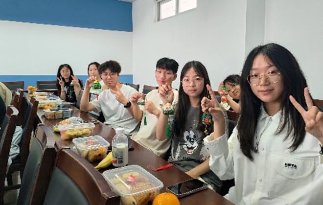 迎端午手工制作香囊活动中,与会老师和同学们一边看香囊制作视频,一边缝制、装艾叶、系彩绳,师生们相互协作、交流心得和想法,克服挑战,最终制成了一个个精美的香囊。小小的香囊里面塞满了艾草,更是对每个人的美好祝福。最后,兴致盎然的老师和同学们举着香囊合影留念。