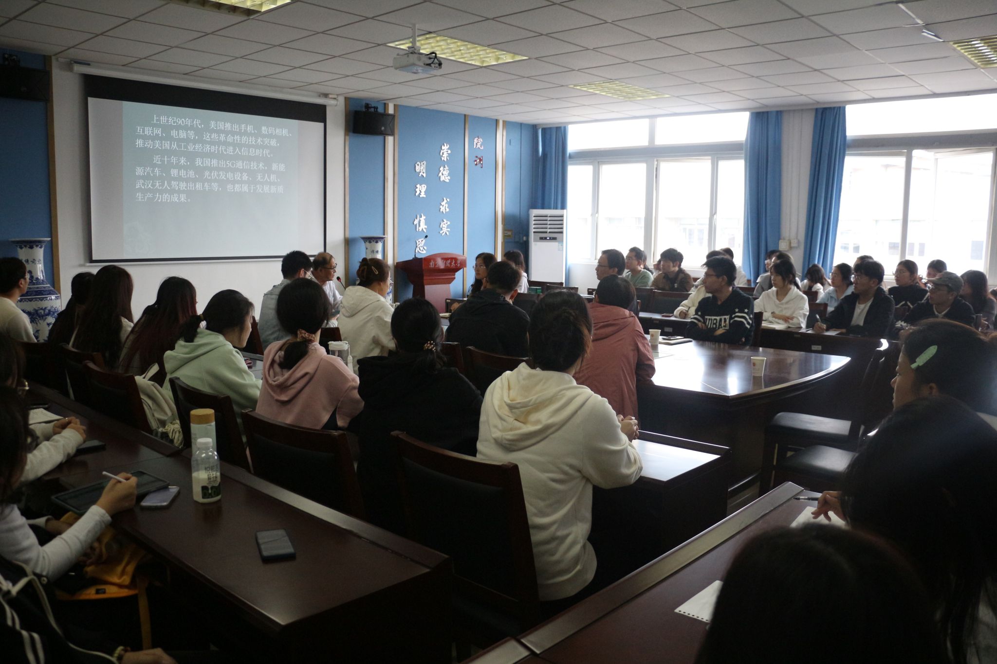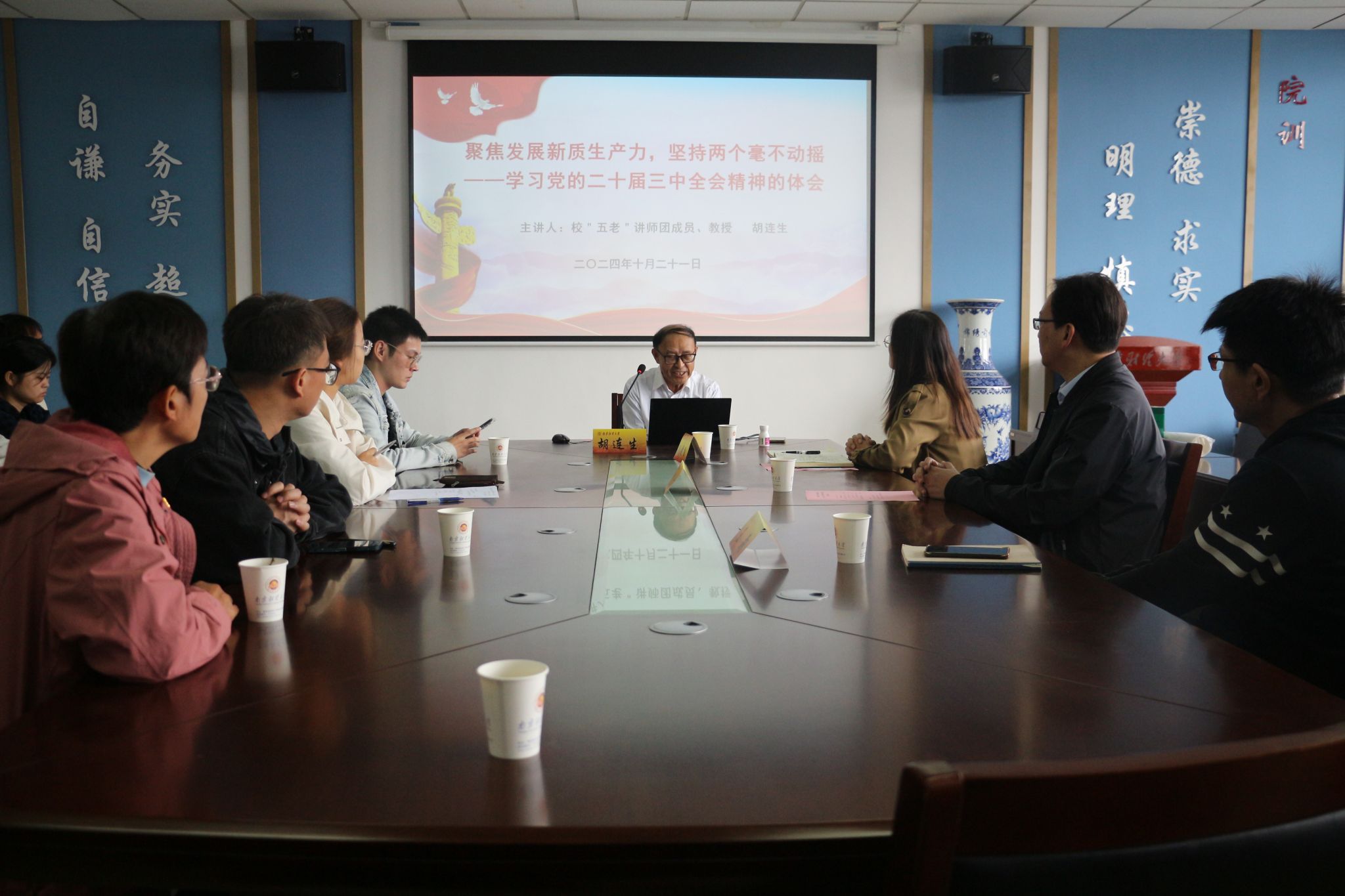 10月21日中午,我院邀请校“五老”讲师团成员、胡连生教授作“聚焦发展新质生产力,坚持两个毫不动摇”关于党的二十届三中全会精神的体会专题报告。院党委书记殷建新、党委副书记孙晓飞,财政与税务学院党委副书记王翔,我院和财税学院学生支部书记及全体党的发展对象培训班学员参加活动。