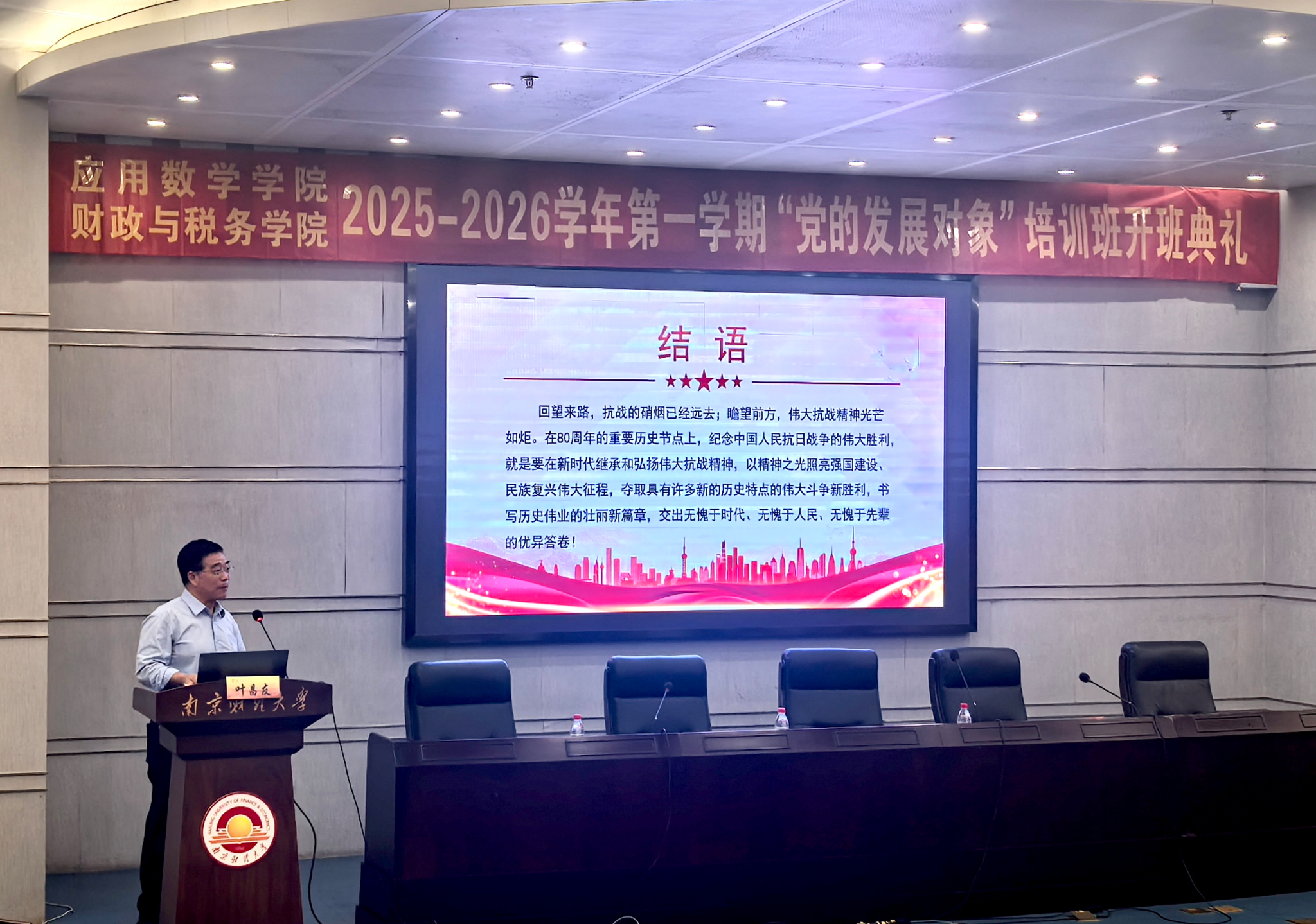 10月16日中午,我院与财政与税务学院在仙林校区行政楼二楼报告厅联合举办2025-2026学年第一学期(第25期)“党的发展对象”培训班开班典礼暨专题讲座。校“五老”讲师团成员、离退休老教授叶昌友,财政与税务学院党委书记陈苏、党委副书记王翔,我院党委书记殷建新、党委副书记孙晓飞出席典礼,全体党校学员参加开班典礼。开班典礼由殷建新书记主持。