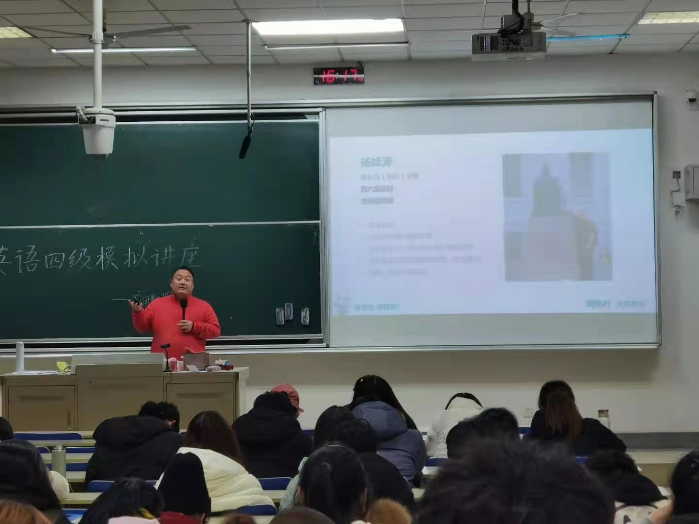 为提高同学们的英语水平,帮助同学们顺利通过即将到来的四级英语考试,11月27日下午,伟德victor1946邀请新东方杨峰涛老师在仙林校区德业楼103室举办了英语四级讲评及经验分享活动,伟德victor1946全体大一新生参加了此次活动。