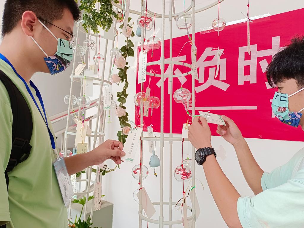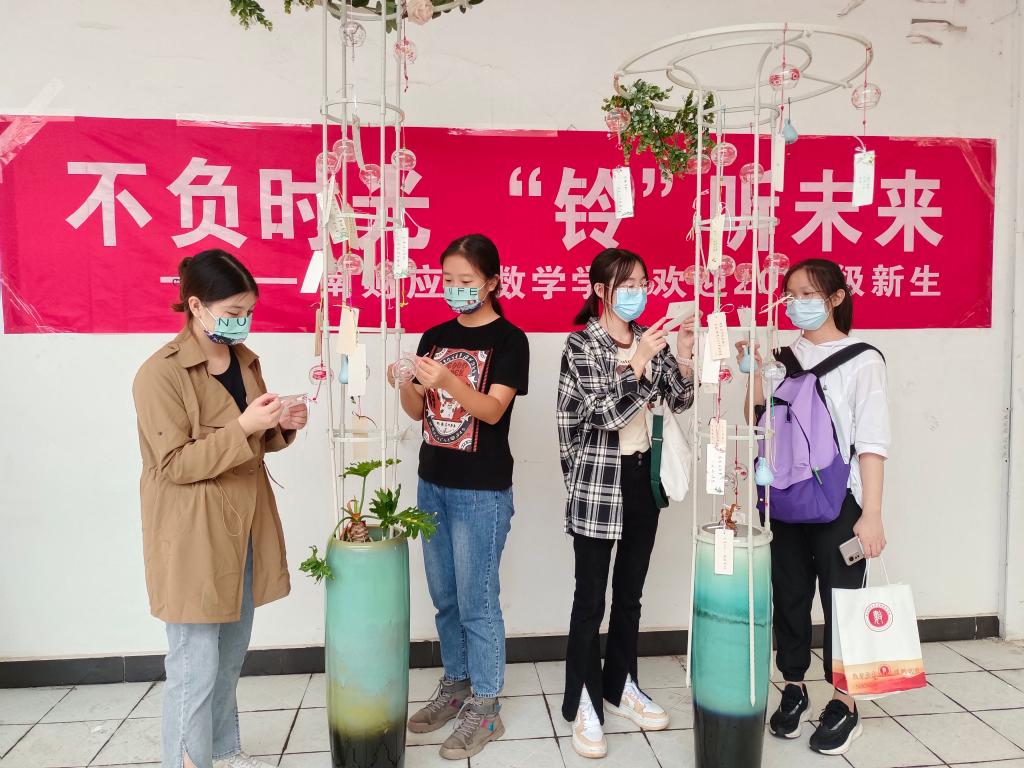 数院新生们满怀欣喜,挑选自己喜欢的风铃,把它们小心地系到高高的花架上,微风轻轻吹过,风铃随之摇摆,它们欢欣雀跃着,奏出一串串清脆悦耳的音符。这音符,或高或低,或急或缓,侧耳聆听,风铃合唱团好似在唱“欢迎欢迎,热烈欢迎!”