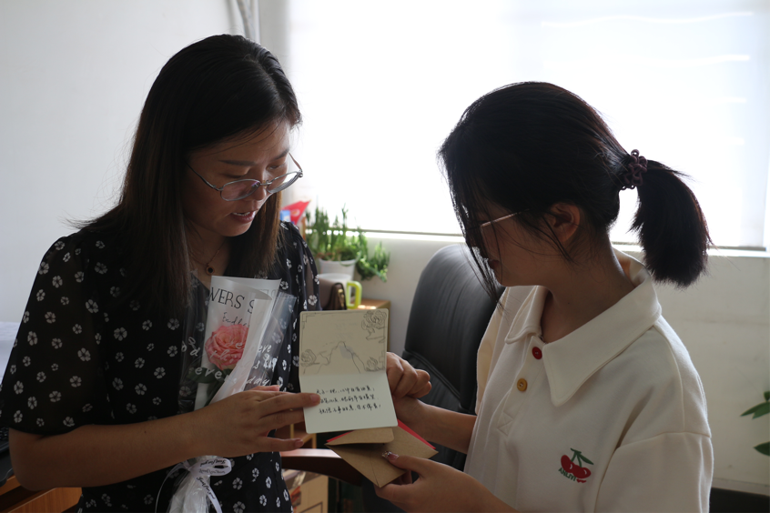 活动分为书写祝福语,鲜花赠礼和祝福传递三个环节。同学们运用所学的知识,以数学语言表达心中对老师的感谢与祝福。“我们像标量,只有大小,没有方向,您帮助我们寻找梦想,有了方向,成为向量,祝您在新的一年里,健康平安,万事如意!”“‘成功=您的教导+我们的努力。’您把公式填了一半给我们,我们也会出色地完成另一半!横式竖式,算不尽老师的爱;字里行间塞不下老师的情。老师,祝您教师节快乐!”字字句句都充满了同学们对老师浓浓的感恩与祝福。同学们将每一朵绚烂的鲜花细心呵护,与富有数学韵味的贺卡一同献给敬爱的老师。同学们真挚而郑重。老师们接过贺卡与鲜花,满是欣慰与喜悦,此刻,祝福完成了传递。