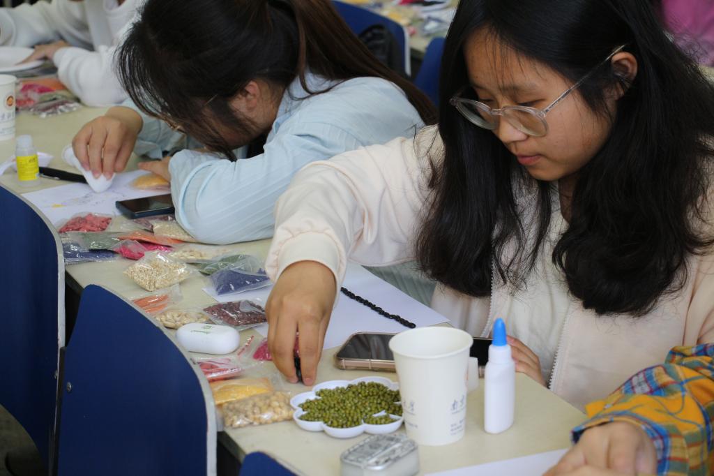 活动伊始,刘昱辰老师通过线上与线下相结合的方式作了“劳动最崇高”主题宣讲,带领同学们学习习近平总书记在全国劳动模范和先进工作者表彰大会上的重要讲话,引导同学们向劳动者致敬,传承新时代劳动精神,激励同学们牢记习近平总书记的嘱托,继续精进学业水平,大力弘扬劳模精神、劳动精神、工匠精神,牢固树立马克思主义劳动观。继而,刘老师和同学们一起制作五谷杂粮画。大家先在硬纸上用铅笔勾勒出象征着“劳动”的画作轮廓,接着,将胶水沿着轮廓形状均匀涂开,最后把不同颜色的五谷杂粮种子粘贴在相应的位置,一幅幅色彩鲜明而又意义非凡的作品便诞生了。制作完成后,大家选出了优秀画作的作者上台讲解他们使用的五谷杂粮的名称、产地以及相关的历史名人故事,并发表他们各自制作五谷杂粮画的想法和灵感以及对于新时代劳动精神的理解与认识。江宇森同学讲到:“‘时代飞速向前,但劳动之美,永不褪色’,希望劳动精神能在新时代继续绽放光彩。”