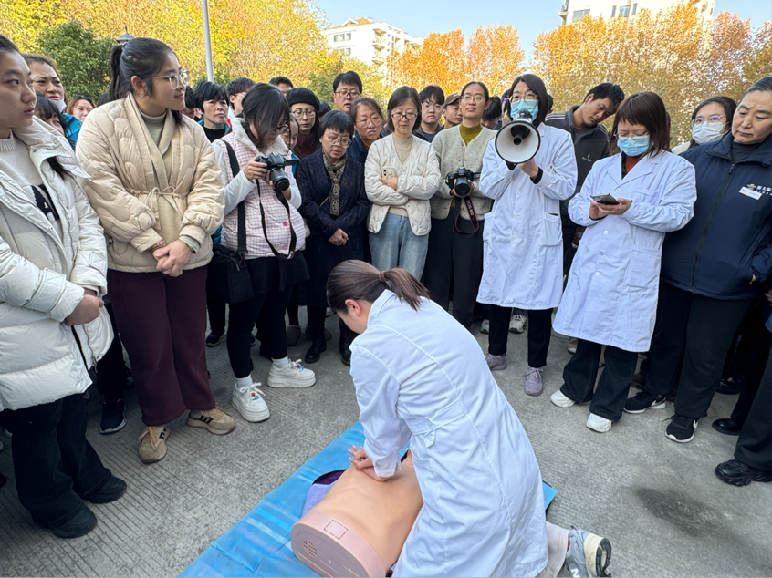 疏散结束后,校医院医护人员为大家现场演示了心肺复苏、伤口包扎等常用急救技能,并详细讲解操作要点与注意事项。现场师生积极参与实操练习,医护人员逐一指导纠正,帮助大家准确掌握急救流程。