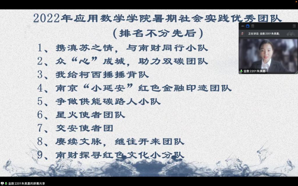 会议伊始,院团委社会实践部朱美嘉介绍了2022年我院暑期社会实践开展基本情况。随后,5支优秀社会实践团队应邀做经验分享。