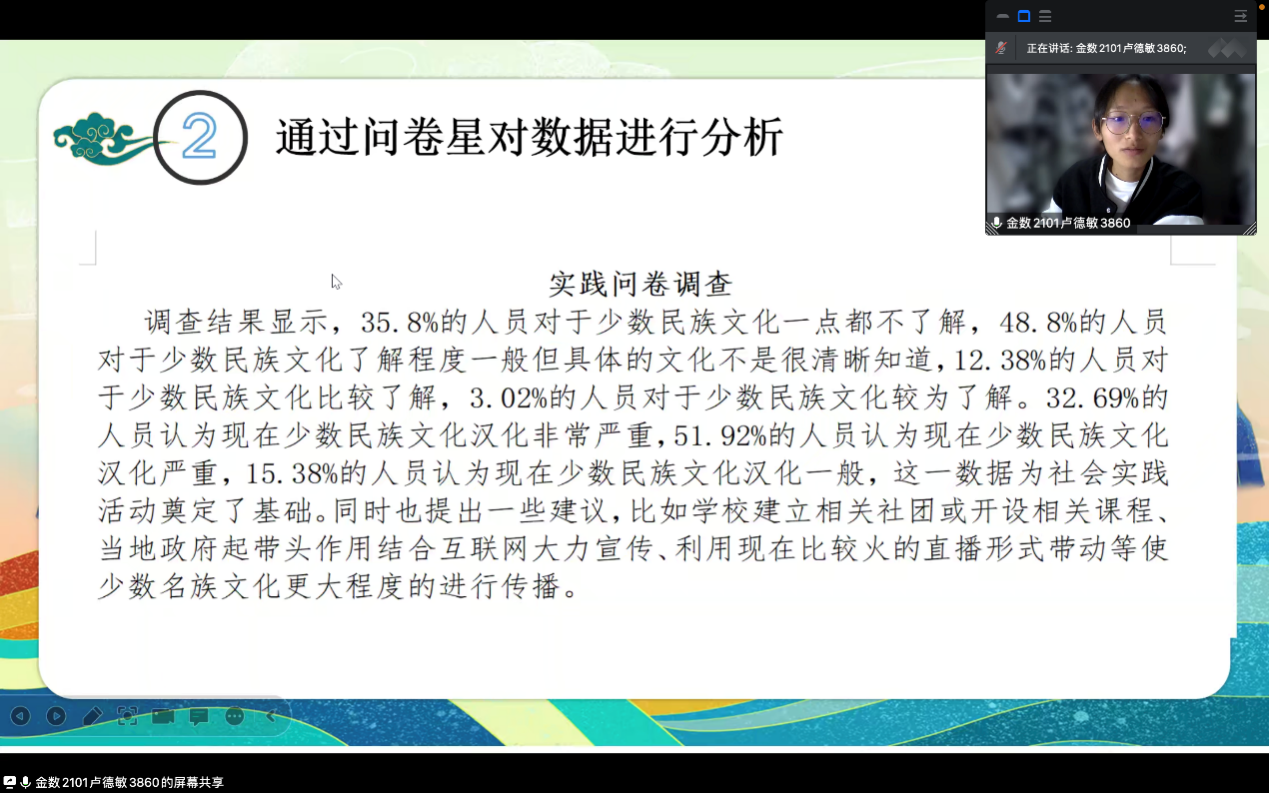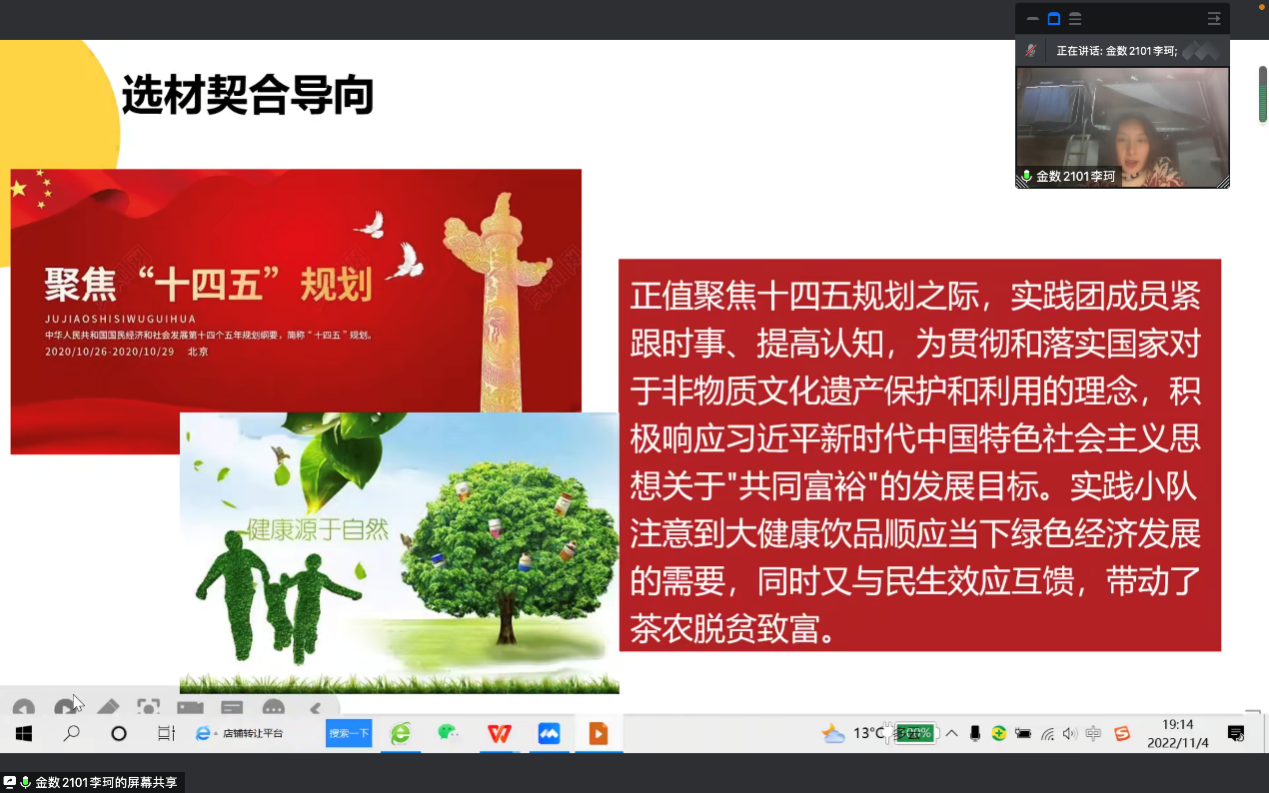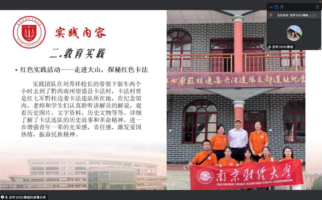 我院“携滇苏之情,与南财同行”团队分享了他们的普洱茶醋工厂之旅,深入地了解了顺应“绿色大健康”理论的普洱茶醋在疫情下如何与民生形成互馈机制,如何解决普洱茶滞销问题、带动当地茶农脱贫致富;我院来自苗族的“赓续文脉,继往开来”实践团介绍了贵州苗族的文化发展历史,分享了当地苗族独有的一项非遗——蜡染技艺,并对实践中发现的问题提供了建议。通过各个团队的分享,同学们仿佛身临其境,燃起暑期社会实践的热情,期待有更多的机会走出校园,走进社会,走进基层,为构建美好的社会添砖加瓦。