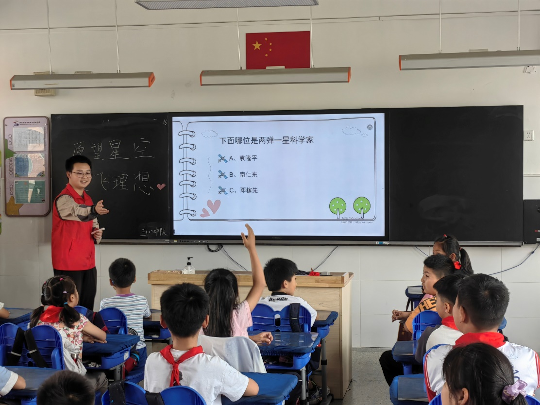 宣讲中,志愿者以三十七年前邓稼先院士和杨振宁先生在端午节后的会面为切入点,从“两弹一星”精神的内涵、我国“两弹一星”自研制之初到研制成功的伟大历程、“两弹一星”功勋奖章获得者介绍、我国关键技术领域的先进范例四个方面,层层递进、全面系统地阐述了“两弹一星”精神。深入浅出地讲解、通俗易懂的语言、生动鲜活的人物和事例让同学们的注意力高度集中,全情投入。