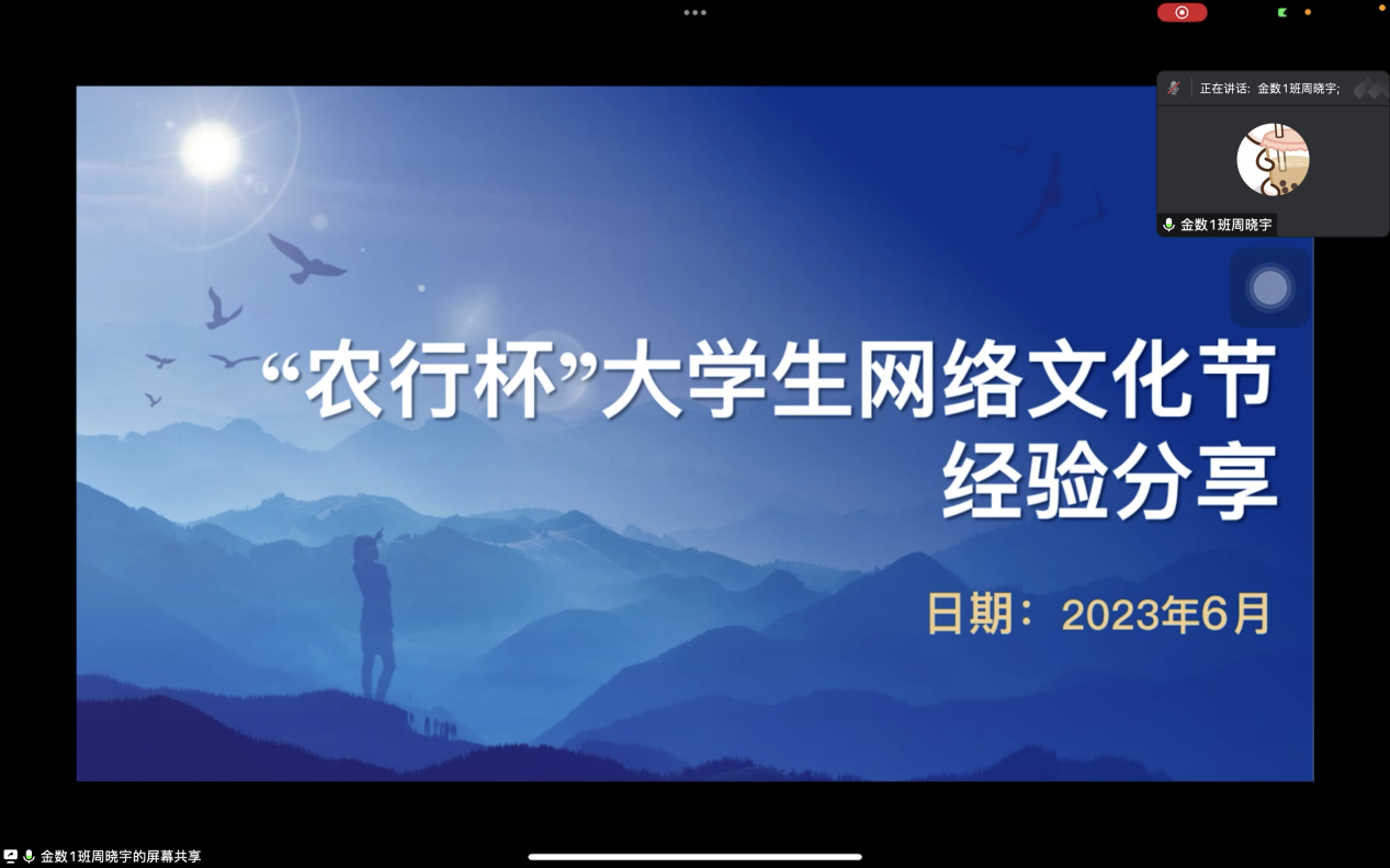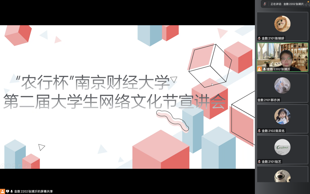张婧沂首先向大家介绍网络文化节的相关文件,分别从活动通知、作品创作的选题指南和作品征集类型三部分做了详细讲解。其中着重讲述了作品征集类型的要求,针对九大类作品展开介绍,例如网文作品的选取主题、微视频提交的作品大小与格式等。宣讲会邀请上届大赛网文一等奖获得者我院金数2001班周晓宇同学作经验分享,她结合具体参赛作品从主题选择、立意确定、素材收集、行文技巧等方面和同学们做了经验分享,鼓励同学们抓住机会,积极参与此次活动。